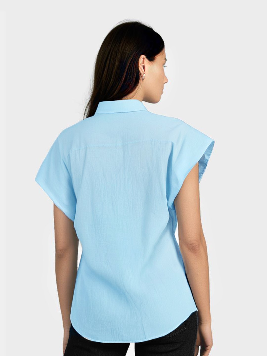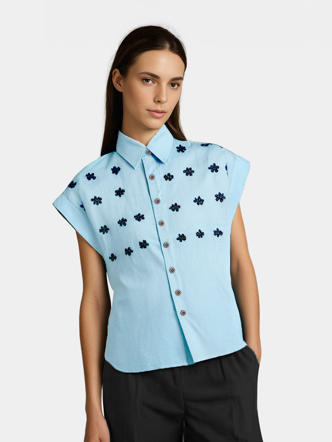 A breathable cotton women’s shirt with elegant short sleeves, adorned with randomly tucked delicate flowers for a charming, feminine touch .
