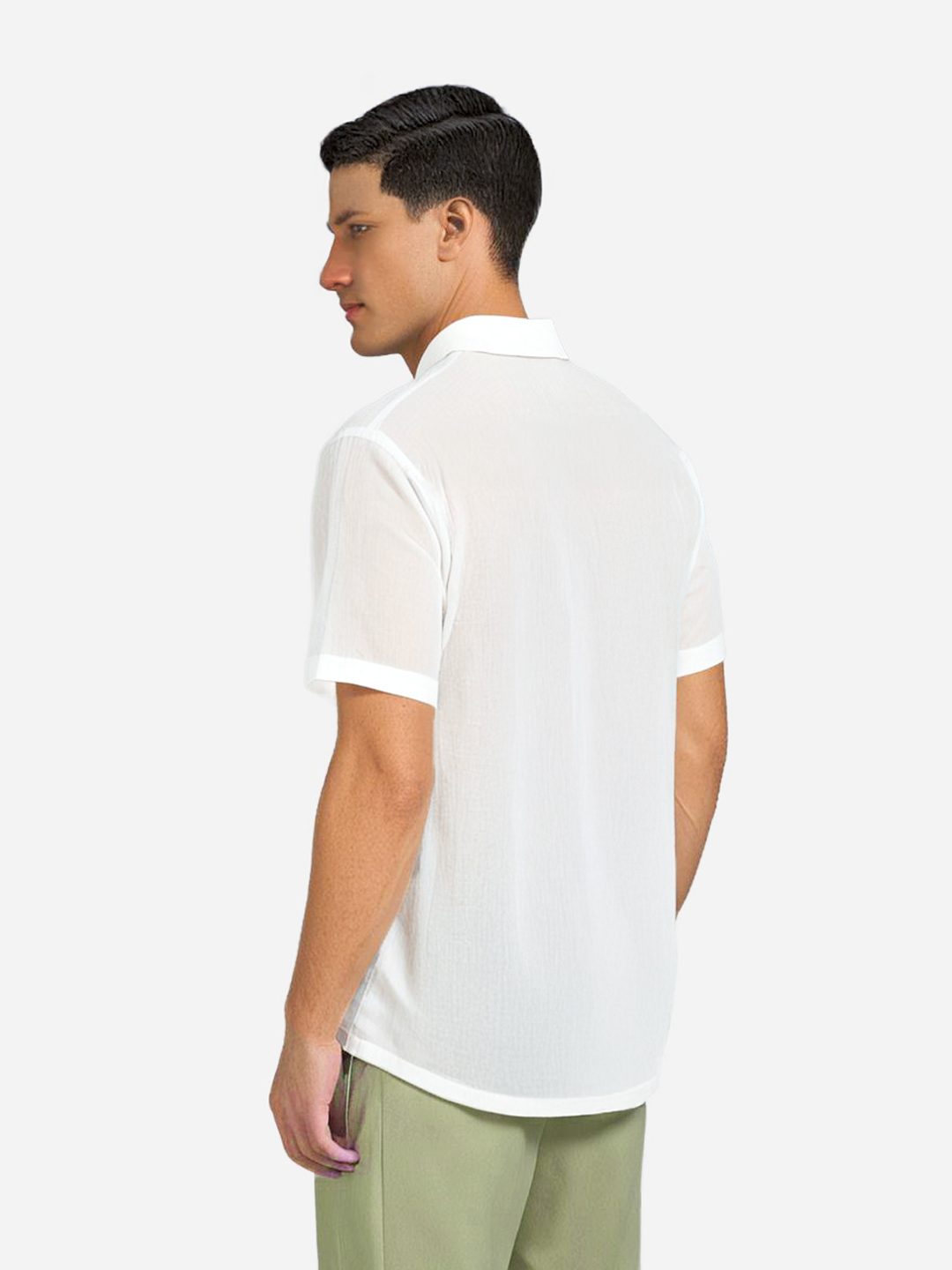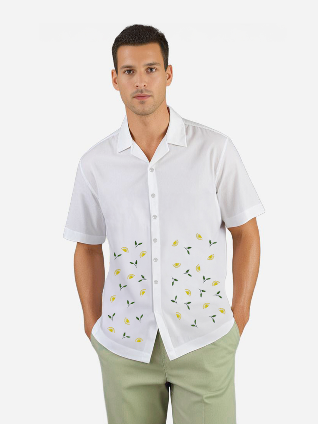 A crisp white cotton shirt for men , featuring intricate embrioded leaf and citrus motif for a fresh , elegant look . Perfect for effortless style with a touch of nature- inspired detailing .