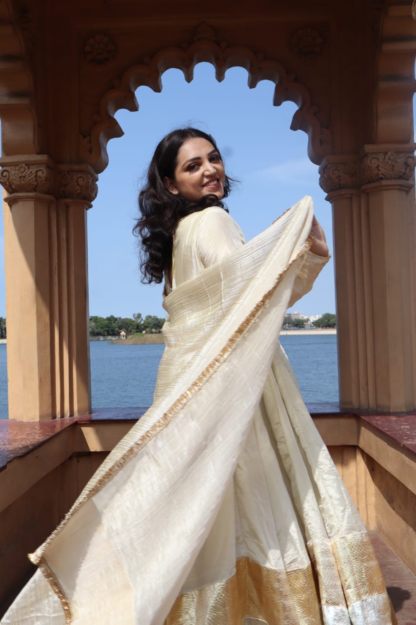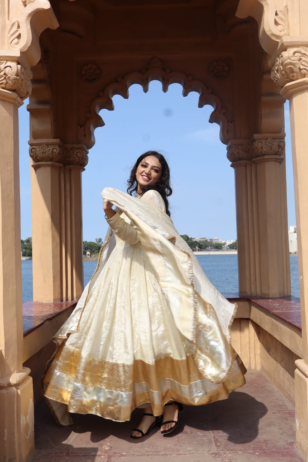 A masterpiece in understated opulence, this ensemble is crafted from pure tissue silk that catches light with a subtle, liquid-gold sheen. The silhouette features a magnificent 10-meter flare, creating fluid movement with every step. Intricately finished with broad gold-woven borders, it embodies a perfect balance of grandeur and grace.