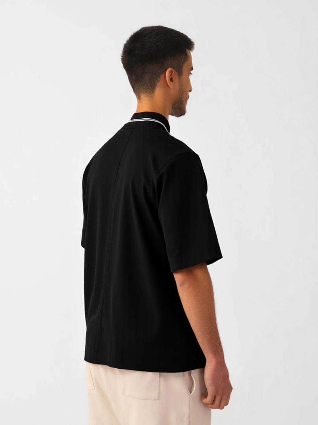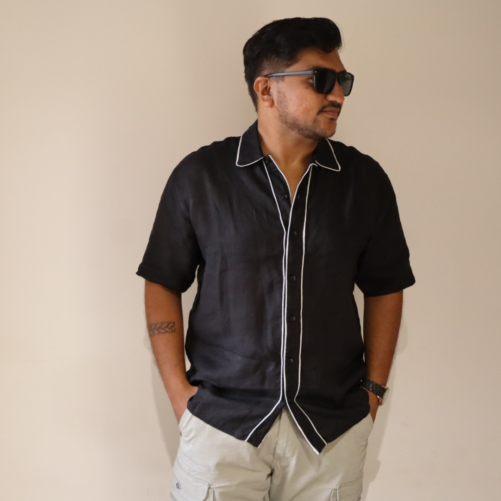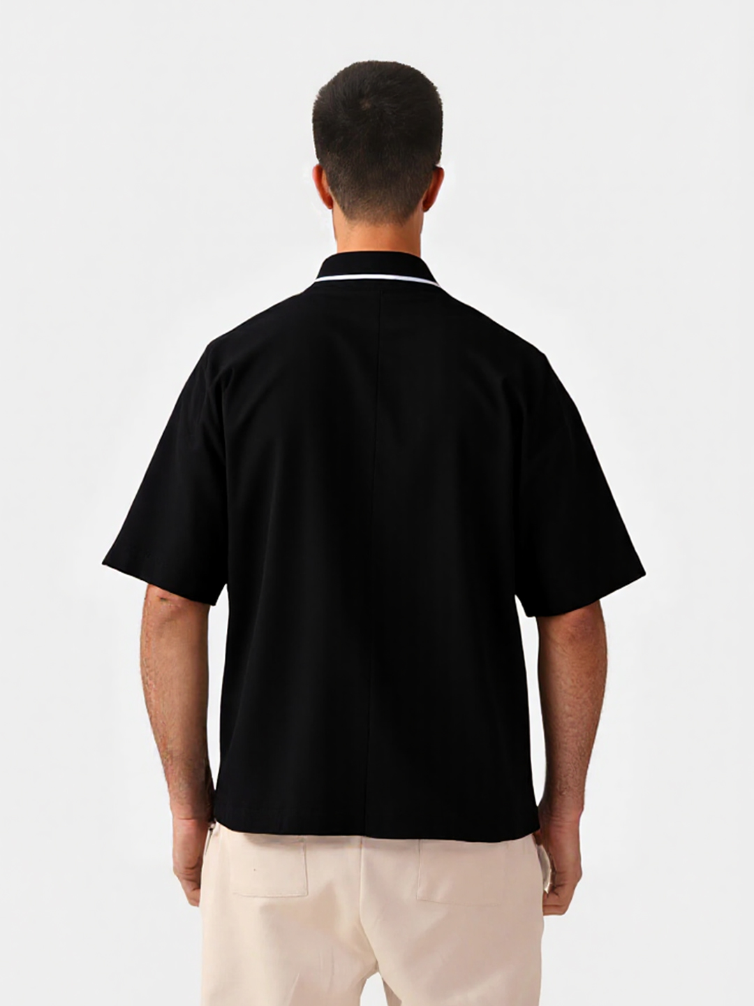 Noir Lining Shirt is a classic black shirt with sleek white piping accents. Its sharp contrast adds a refined and modern touch .Perfect for effortless style with a bold edge .