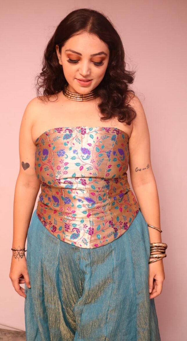 The structured corset top, crafted from rich Paithani weave, captures the essence of traditional artistry, while the flowing shimmer-crush palazzo adds a touch of modern glamour and effortless movement.