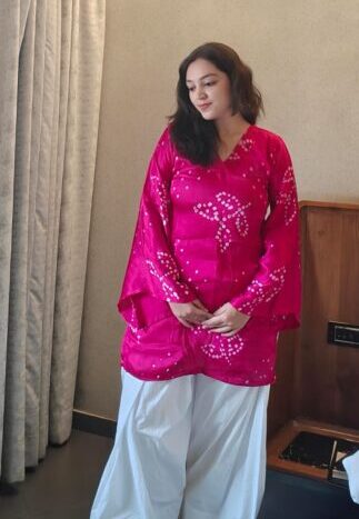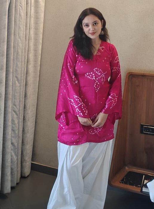 The smooth, lustrous Gaji silk adds a rich texture and flow, while the red hue paired with classic white Bandhej motifs gives it a striking look perfect for festive gatherings, cultural events, or statement everyday wear.